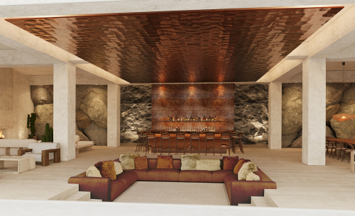private terraces and open-air lithium baths facing the salt flats. Common areas include